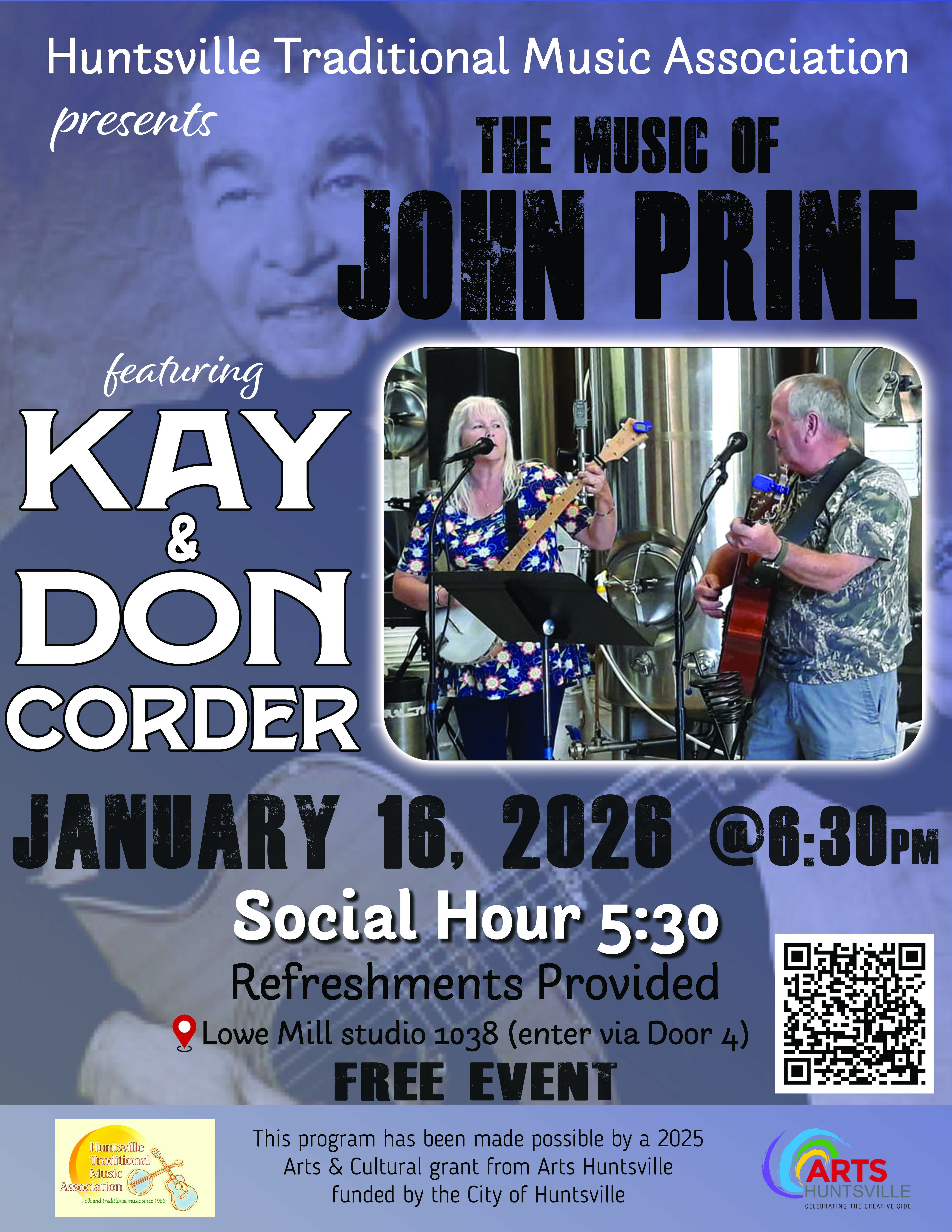 HTMA invites you to celebrate 60 years of enjoying and supporting traditional music forms in the Tennessee Valley. The evening will feature HTMA members Kay and Don Corder performing the Music of John Prine at 6:30 PM. Please plan to arrive at 5:30 and join us for a Social Hour featuring hors d’oeuvres and soft drinks. You are welcome to BYOB your favorite drink. New HTMA president Dan Malloy will introduce the new club officers and chairs and highlight some of the exciting plans and benefits that members will enjoy in the coming year. Admission is free.